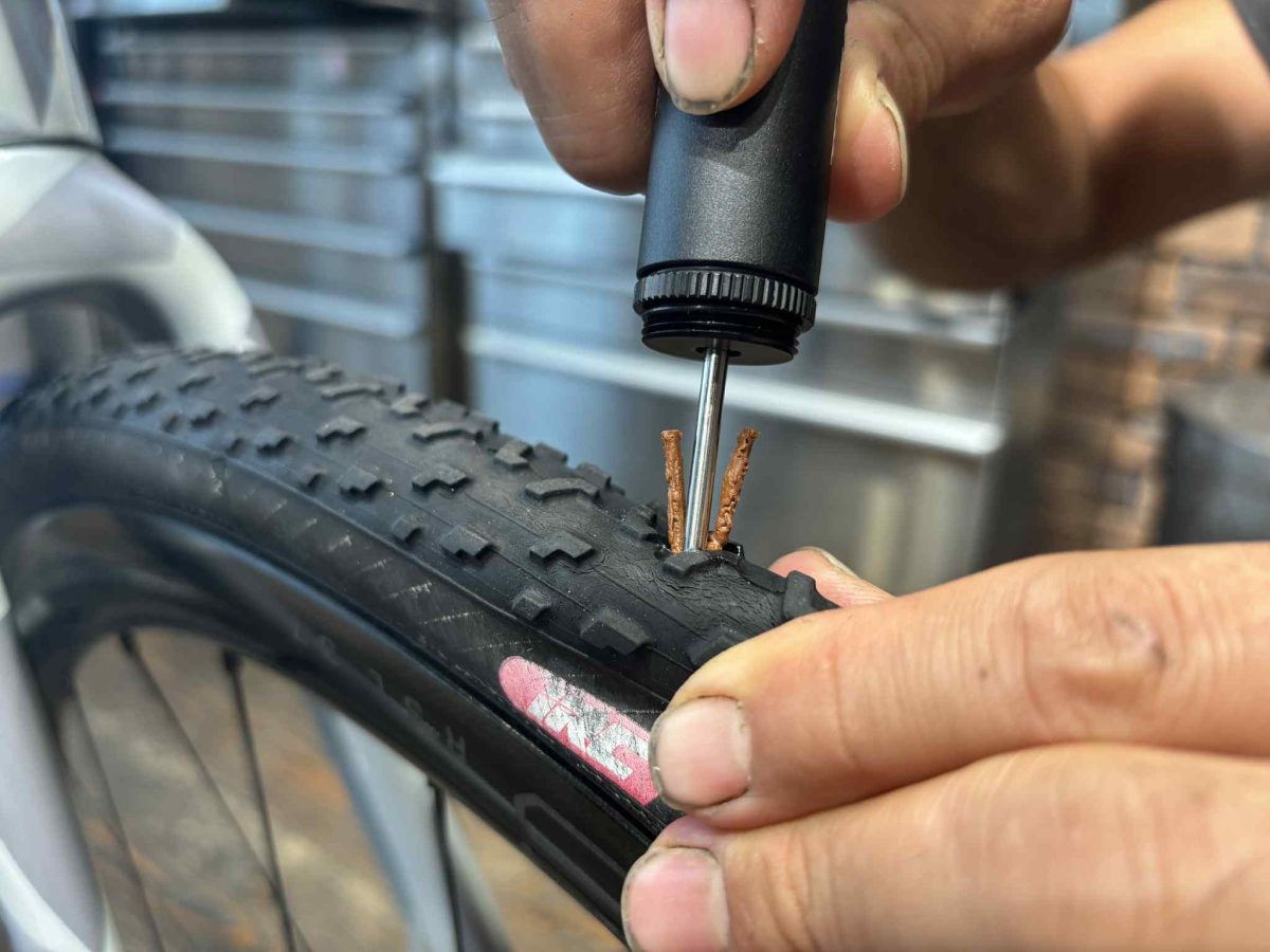チューブレスでもシーラントが抜けてしまっていると異物が刺さった際にパンクを止めてくれるにくくなります。ですので定期的にシーラントの補充は必要です。また、シーラントが入っていたとしても接地面から離れている所に穴が開いたり、大きな穴に関してはパンクを止めてくれる事はありません。修理の方法としてはシーラントを足して穴に向かって流し込む、穴を埋める、チューブを入れる、等がございます。